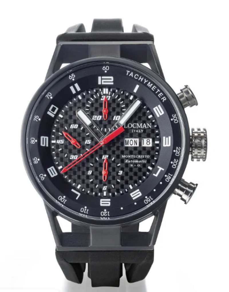 Orologio Locman Montecristo crono automatico meccanico col la cassa di 44mm cassa nera PVD cinturino gomma, quadrante nero