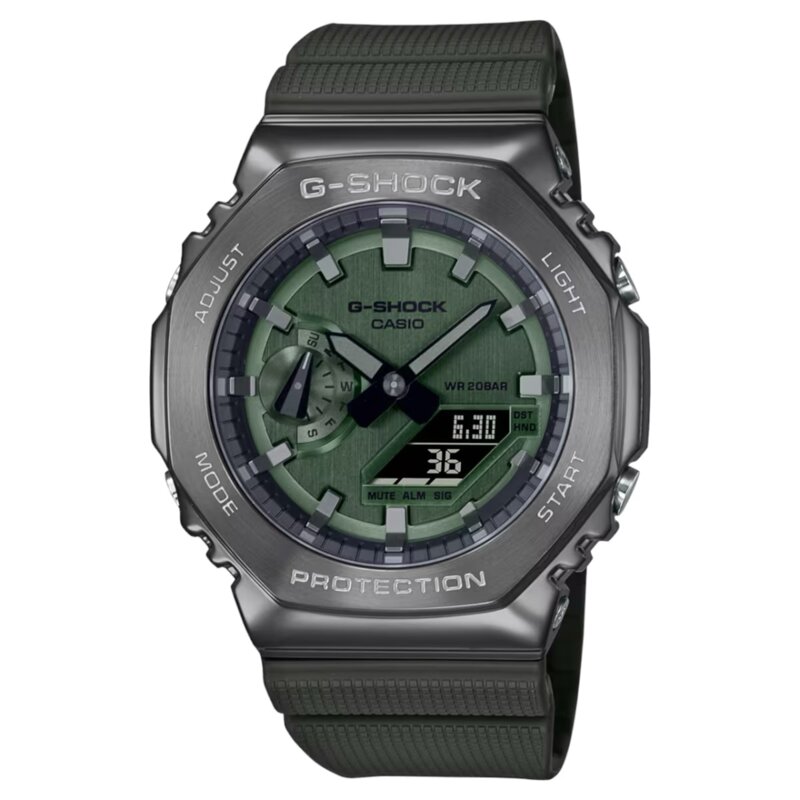 Orologio uomo Casio G-Shock della collezione GM-2100 realizzato con cassa in resina rinforzata con acciaio color nero con un diametro di 49,3 mm x 44,4 mm ed uno spessore di 11,8 mm. Il quadrante è color verde con indici color nero in neobrite. Ha un vetro minerale e la sua resistenza all'acqua è di 20 ATM. Il cinturino è realizzato in resina color verde con una chiusura a fibbia ad ardiglione. Ha la struttura resistente agli urti e il suo peso è di 72 gr.